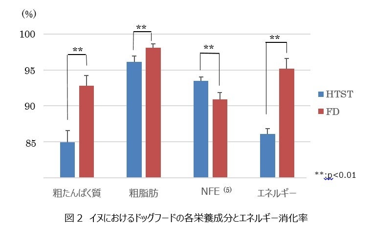 その結果、フリーズドライ製法のドッグフードは一般的なHTST加工のドッグフードと比較し、特にタンパク質の消化率が有意に高いことが分かりました(図2)。また、このタンパク質の消化率の差によって、エネルギー効率もフリーズドライ製法がHTST加工を大きく上回りました。