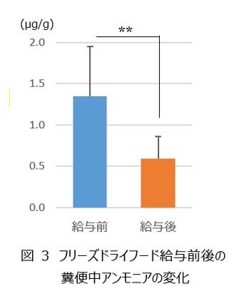さらに、フリーズドライ製法のドックフードによる糞便中のアンモニアの変化について検証しました。普段、HTST加工の総合栄養食ドックフードを食べている家庭犬18頭にフリーズドライ製法のドッグフードに切り替えてもらい、3週間の給与前後で糞便を採取してアンモニアを測定しました。その結果、糞便中のアンモニアが給与前に比べ、有意に低減しました(図3)。