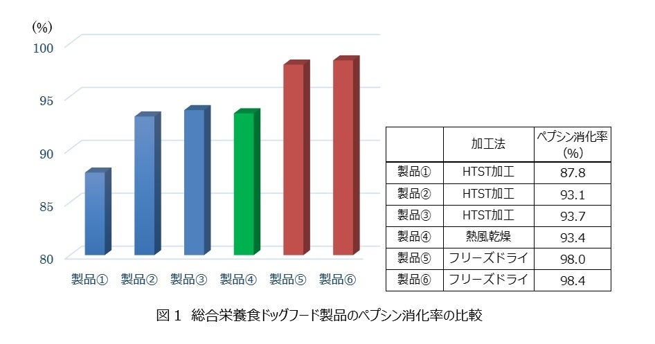 飼料のタンパク質評価法であるペプシン消化率を用いて、ドッグフードにおけるタンパク質の消化率を測定しました。チキンを主原料とする市販のドライタイプの総合栄養食ドッグフードで、エクストルーダーによるHigh Temperature Short Time(HTST)加工(4)品3種、熱風乾燥品1種、フリーズドライ製品2種(うち1種は当社開発品)を、試験に用いました。その結果、フリーズドライ製品は、HTST加工や熱風乾燥に比べ、高いペプシン消化率となりました(図1)。このことから、フリーズドライ製品は、他の製品よりもタンパク質の消化率が高いことが示唆されます。