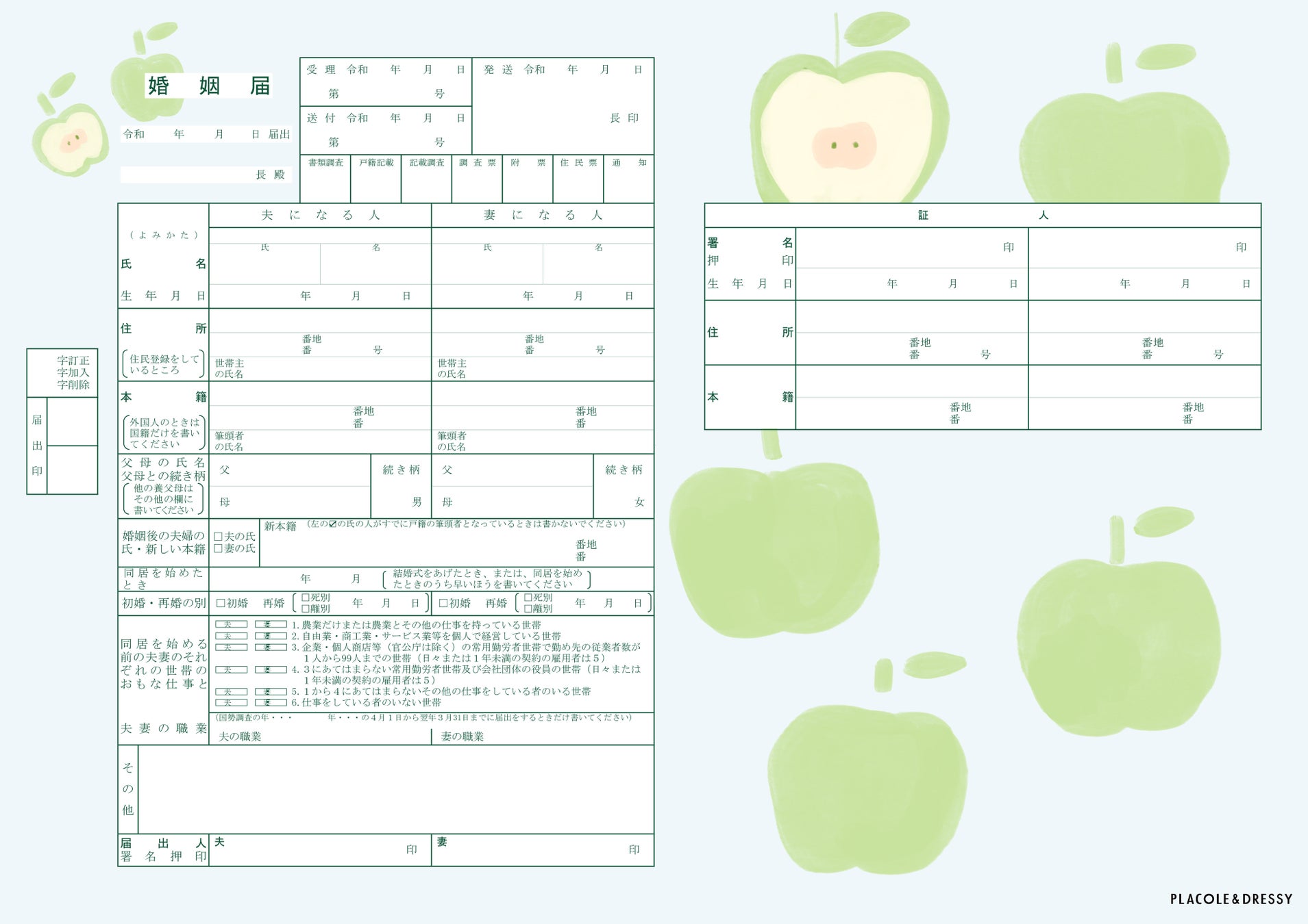 みずみずしい青リンゴをモチーフにした、爽やかな印象の婚姻届です。フレッシュなグリーンとやわらかな水色を基調に、初々しいお二人の新しい生活の始まりを表現しました。