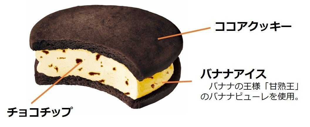 今回発売する「甘熟王チョコバナナサンドアイス」は、アイスに「甘熟王」のバナナピューレを使用しているため、熟したバナナの濃厚な香りや甘さを堪能いただけます。さらにチョコチップを混ぜ込んだアイスをココアクッキーでサンドすることで、チョコチップやクッキー複合的な食感もお楽しみいただけます。
