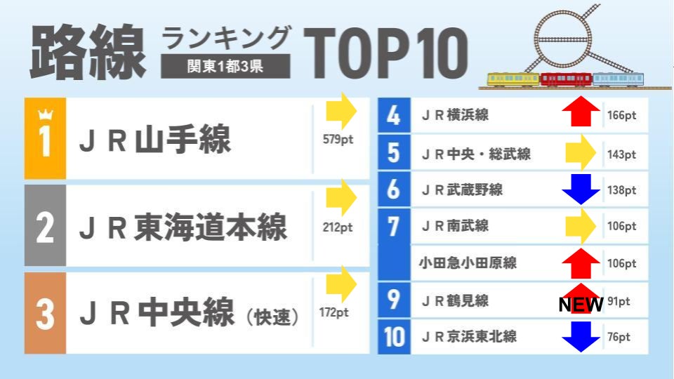 横浜線(4位)、武蔵野線(6位)、南武線(7位)など主要幹線を横につなぐ路線がTOP10 入り!