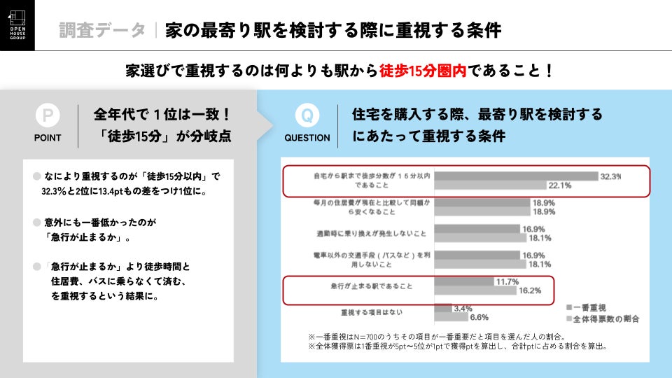「将来、住宅を購入される際に、最寄り駅を選ぶ基準」を重視する順に選んでもらいました。結果、2位の住居費よりも圧倒的な差(1番重視13.4pt差)を付けて「自宅から駅まで徒歩分数が15分以内であること」が1位になりました。昨年の調査でもランキング順位は同じとなっており「徒歩15分以内」は不動の第一条件であるといえます。「電車以外の交通機関を利用しないこと」が「乗り換えなし」とほぼ同率に浮上したことが特筆事項です。