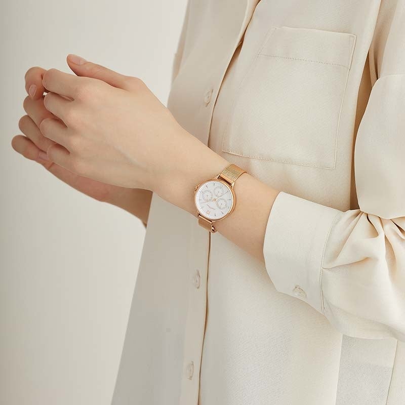 | ●デザインPoint ・3時6時9時位置にさりげなくクリスタルをあしらいました。 ・文字盤の天然パールは光の当たり具合で七色に輝き、様々な表情を楽しめます。 ●機能Point ・一目で曜日・日付・24時間表示を確認することが可能なマルチファンクションを搭載しています。 ・シンプルなデザインでありながら1秒単位で目盛りが刻まれているため、実用性にも富んでいます。 ・傷がつきにくいサファイアガラスを使用しており、より長くご愛用いただけます。 ●スペック情報 ソーラークォーツムーヴメント(フル充電時6カ月駆動) / ステンレススチール / サファイアガラス /日付・曜日・24時間表示 / 3気圧防水 / パールダイヤル/スライド式バックル /ケースサイズW33㎜×H33㎜ / 月差±20 |