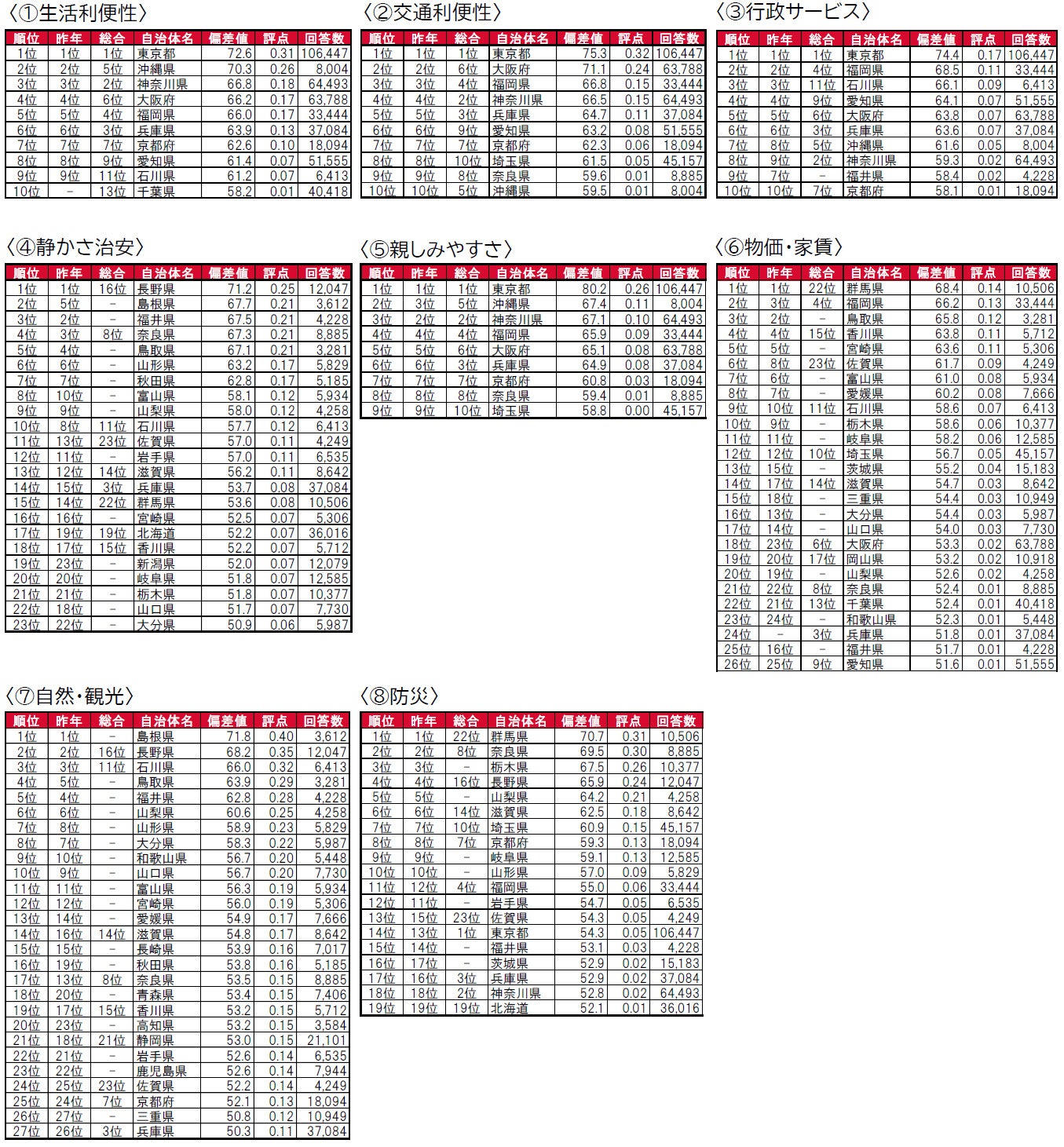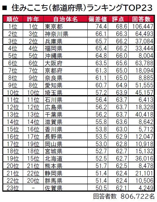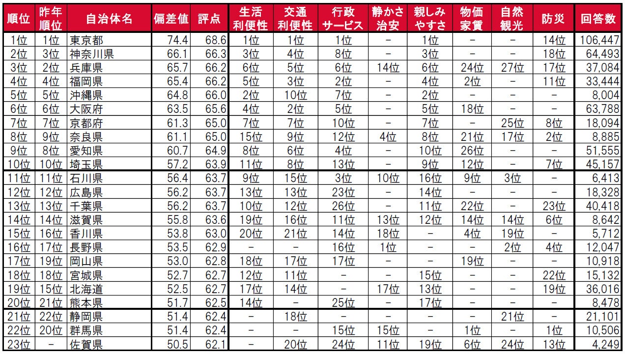 1位は、唯一偏差値70台の高い評価を得て、4年連続で東京都です。2位は昨年3位の神奈川県、3位は昨年2位の兵庫県です。4位~6位は2年連続で、福岡県、沖縄県、大阪府がランクインしています。8位の奈良県は、昨年9位から一つ順位を上げました。