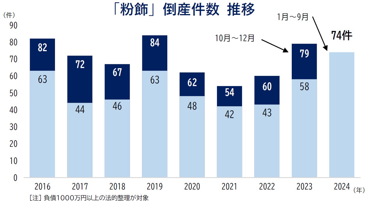 2024年1月~9月の「粉飾」倒産は74件となった。前年同期と比べると16件(前年同期比27.6%増)多く、3年連続で前年同期を上回った。1月~9月として集計開始の2016年以降で最多となり、2024年通年でも年間最多件数(2019年・84件)を更新する可能性が高い。