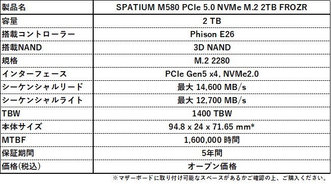 【SPATIUM M580 PCIe 5.0 NVMe M.2 2TB FROZRの主な特徴】