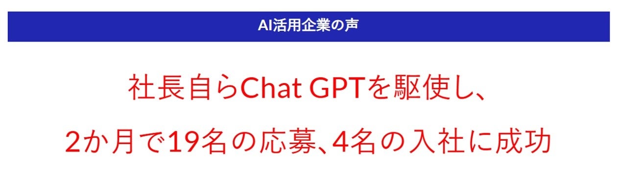 群馬県高崎市の日高運輸株式会社様では、社長自らがChatGPTを駆使し、2か月で19名の応募、4名の入社を実現しました。ChatGPTで求人文章を作成し、欲しい人の年齢層や特徴などのターゲットを細かく指定したことで、多くの応募獲得に繋がりました。