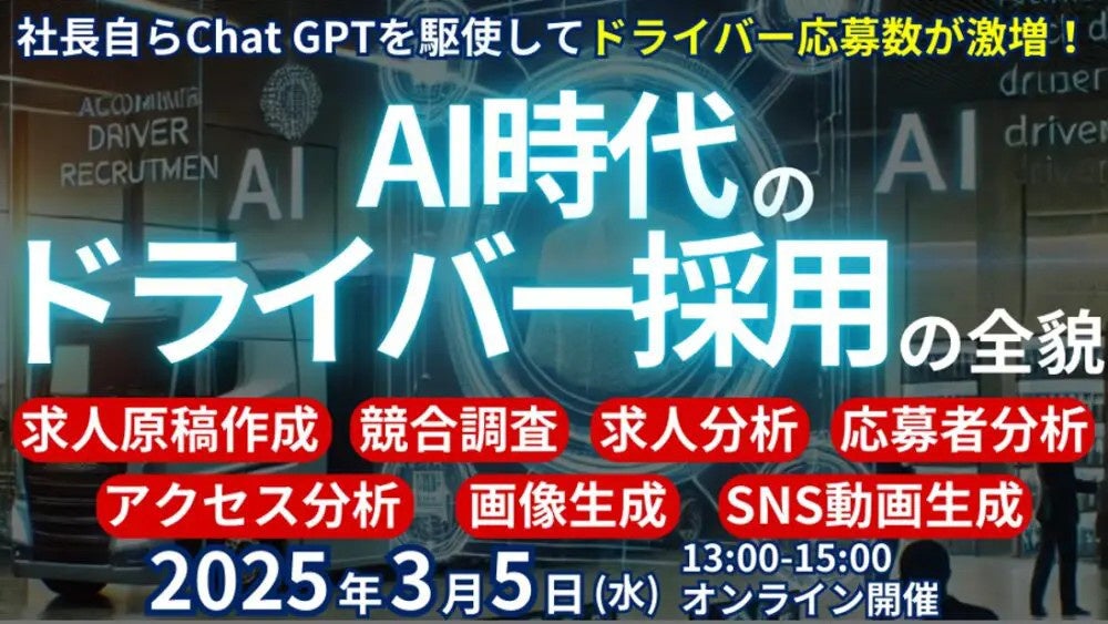 日本最大級の物流コンサルティングファーム 船井総研ロジ株式会社(本社:大阪市中央区、代表:橋本直行、以下「船井総研ロジ」)は、2025年3月5日(水)13:00~15:00、 運送会社・物流会社経営者の方々を対象にした「AI活用ドライバー採用セミナー」をオンラインで開催いたします。