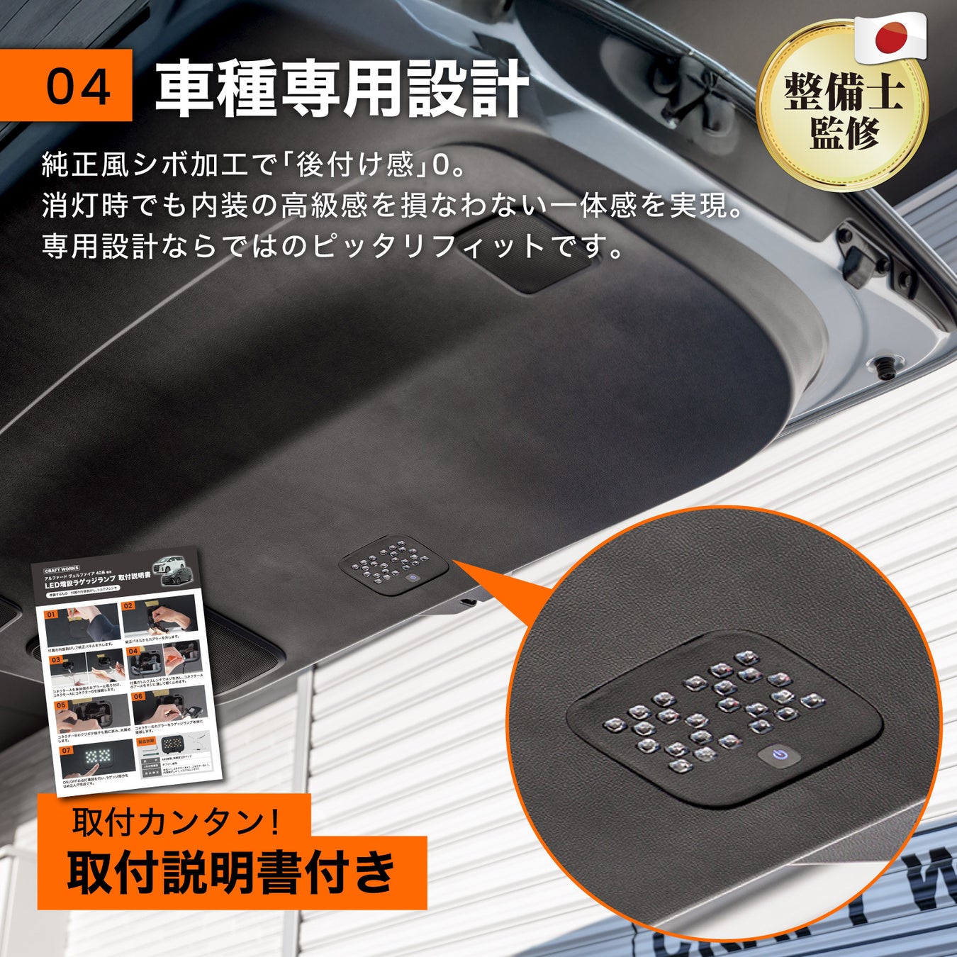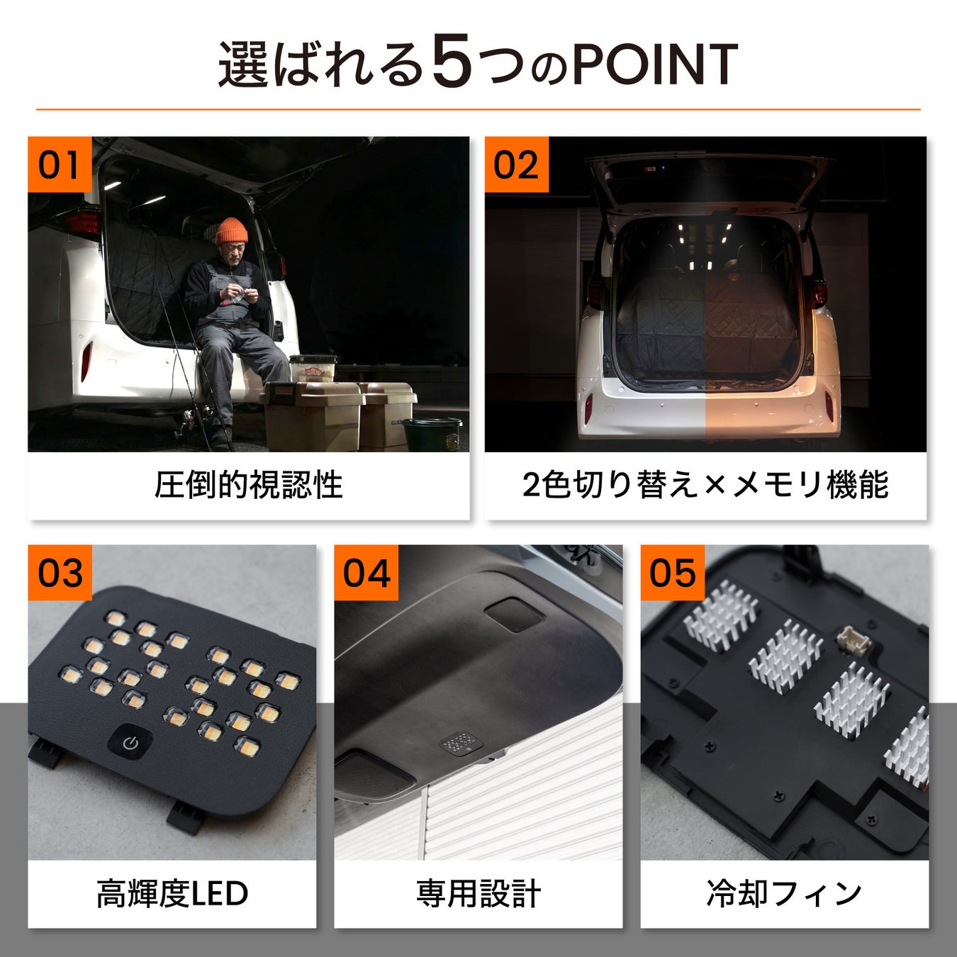 広範囲を均一に照らす高輝度LEDを採用し、ホワイトと暖色の2色切り替えに対応。前回設定を保持するメモリ機能や冷却フィン構造、純正風シボ加工の専用設計により、使いやすさと内装になじむ一体感を追求しました