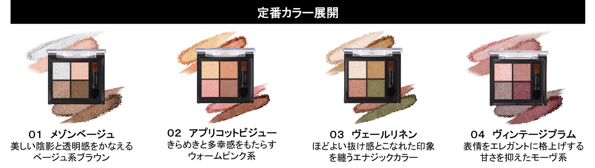 質感の異なるクリアラメ、ベースカラー、トーンカラーで構成されたこだわりの4色を配置。