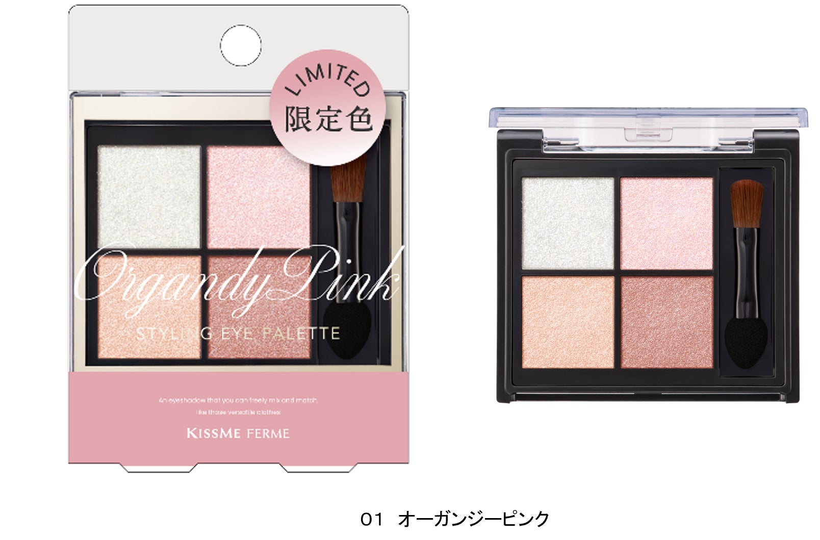 キスミー フェルムの人気4色アイシャドウパレット「スタイリングアイパレット」から、多色の偏光ラメを贅沢に使用配合した限定カラー「オーガンジーピンク」が登場。