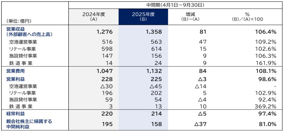 コロナ禍を経て、航空旅客需要は回復から成長ステージへ移行しており、航空機発着回数は、アジア、北米路線を中心とした旅客便の新規就航や増便もあり、全体として前年同期を上回りました。上期の航空旅客数は、外国人旅客数が年度上期として過去最高の1,159万人、日本人旅客数も前年同期を上回る傾向が続いたことから、航空旅客数全体ではコロナ禍以降初の2,000万人を超え、歴代3位の水準となりました。国際航空貨物量も好調で、2024年4月以降、前年同月比を18カ月連続で上回って推移しております。これらの結果、空港使用料収入、旅客施設使用料収入が増収となったほか、新たな需要創出を目的とした新規出店が売上に寄与し、リテール事業が増収となったことから、営業収益は、前年同期から81億円増の1,358億円となり、5期連続の増収、上期としては民営化以降の最高値を更新しました。