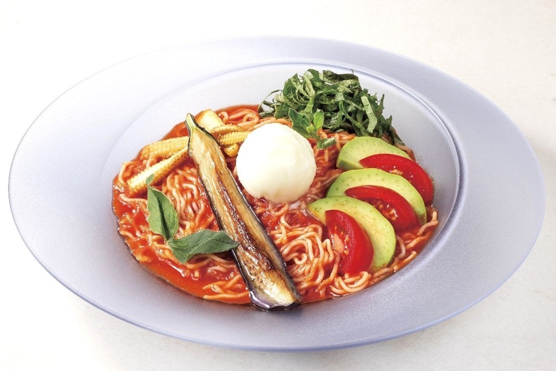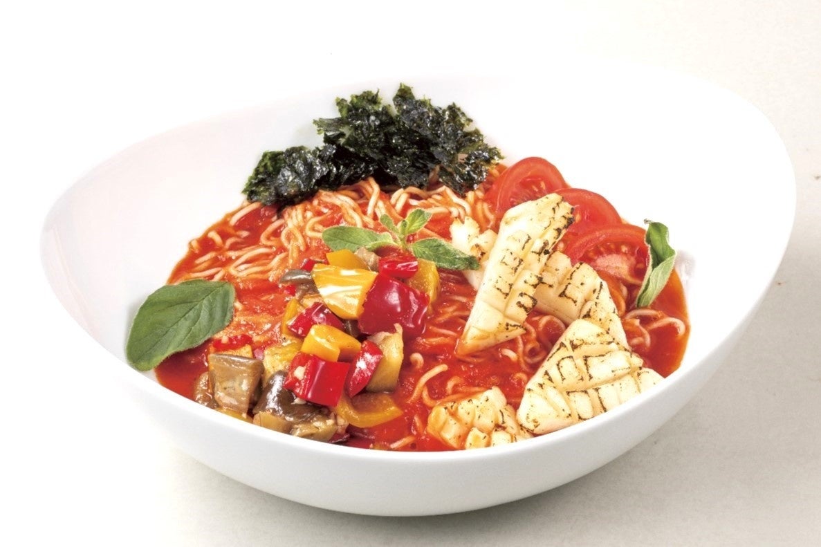 彩り豊かな夏野菜をじっくり煮込んだラタトゥイウに、甘酸っぱい爽快な冷製トマトソースと合わせた一杯。アカイカやコチュジャン風味のフレッシュトマト、韓国のりをトッピングした健康効果も期待できるラタトゥユトマト冷麺です。