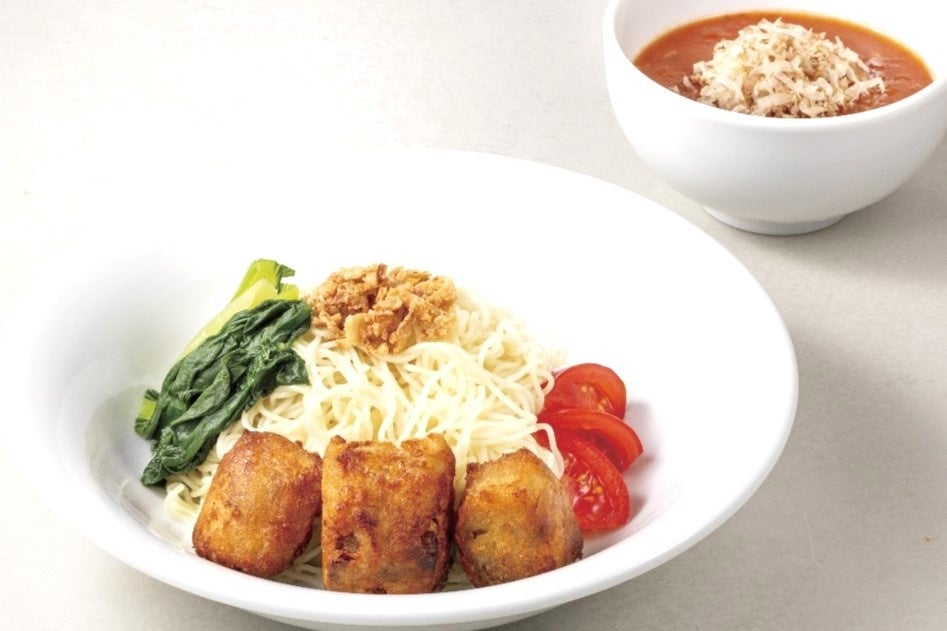 とろっとろっの豚の角煮を揚げて旨味をとじこめたサクとろ食感の和豚カツを豪快にトッピング!喉越しのよい極細豆乳麺を冷水でひきしめ、和風仕立てのトマトスープ(温)と合わせたトマトつけ麺。