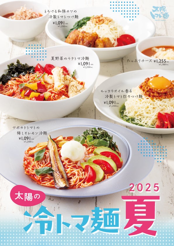 トマトラーメンの専門店「太陽のトマト麺」(運営:株式会社一品香、本社:神奈川県横浜市、代表取締役社長:鳥生恒平)は、夏限定の冷たいトマト麺5種を「太陽の冷トマ麺夏!」シリーズとして、2025年7月8日(火)より期間限定で販売いたします。
