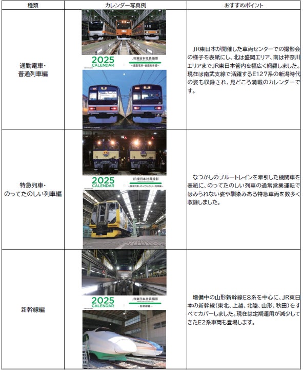 JR東日本の乗務員区や車両センターに所属する社員が、日頃接する光景を撮りためたものを厳選しカレンダーにまとめました。2025年は、「通勤電車・普通列車編」「特急列車・のってたのしい列車編」「新幹線編」の3つにテーマを絞り、3種類のカレンダーを制作しました。通勤電車の通常営業運転ではみられない姿や、のってたのしい列車、増備中の山形新幹線E8系等、JR東日本社員の目線で撮影された貴重な場面を、ぜひともカレンダーでお楽しみください!