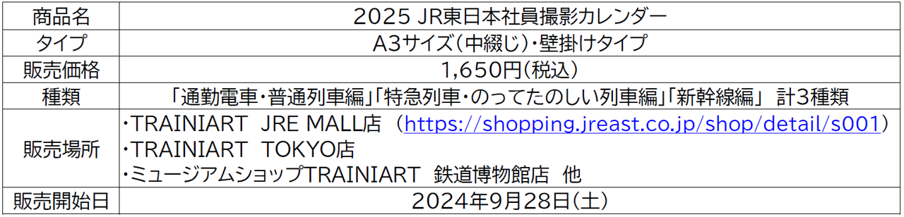 ○東日本旅客鉄道株式会社(代表取締役社長: 喜㔟 陽一、以下「JR東日本」)と株式会社JR東日本商事(代表取締役社長:大西 秀麿、以下「JR東日本商事」)は、JR東日本社員が撮影した写真を使用したカレンダーの販売を行います。 ○JR東日本の社員が撮りためた、車両センターの風景や珍しいアングルから撮影した車両など、普段目にすることができない光景をカレンダーにしました。 ○2024年9月28日(土)より、TRAINIART(トレニアート) JRE MALL店、TRAINIART TOKYO店、ミュージアムショップTRAINIART 鉄道博物館店 他にて販売します。 |