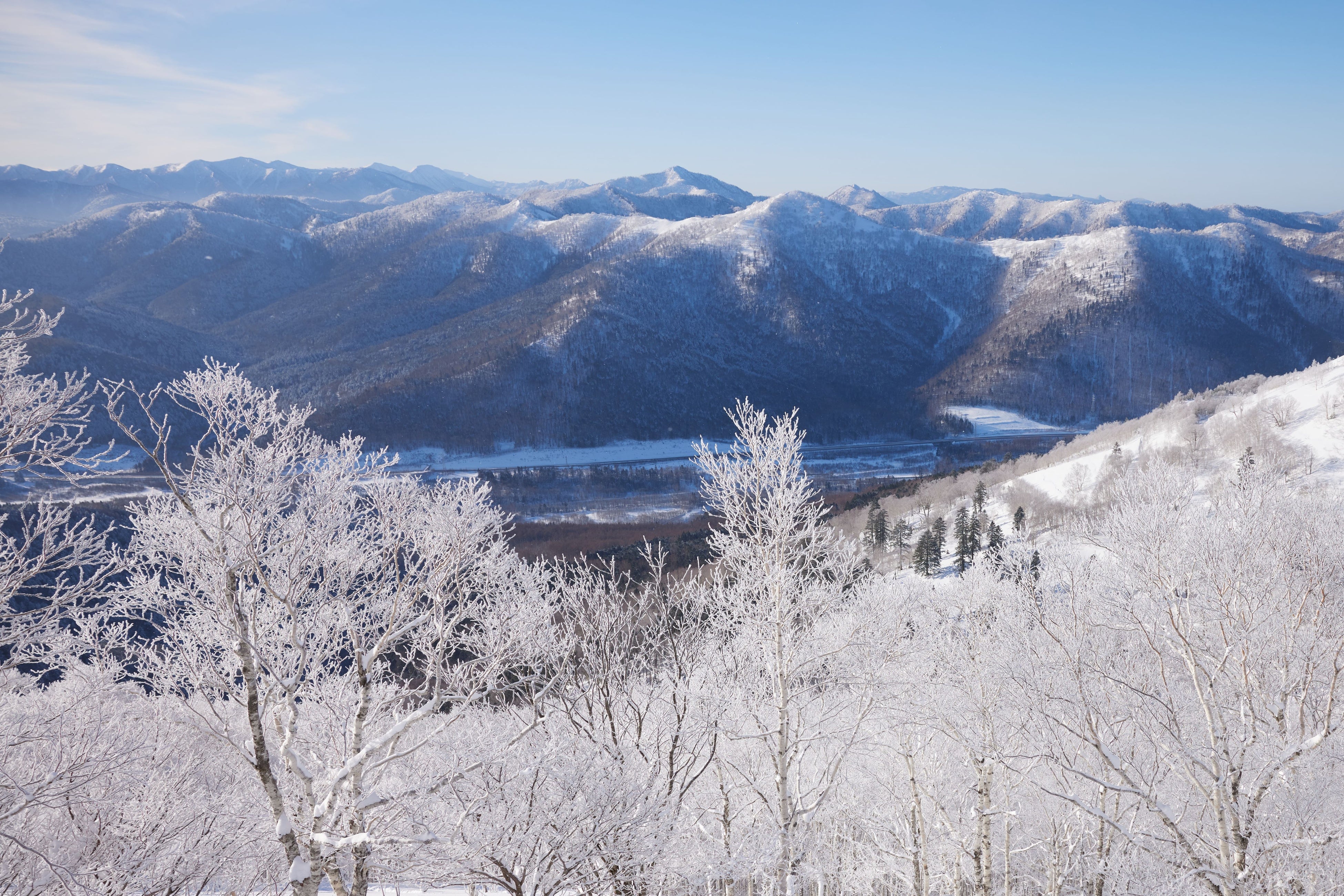 コースの始まり、標高約1,088 メートルの霧氷テラスから、スノーシューで白銀のパノラマを楽しめます。晴れている日には、日高山脈など、雪で覆われた真っ白な大パノラマが広がり、気象条件のあった日には霧氷(*4)の景色も楽しめます。普段はスキーヤーやスノーボーダーしか行くことができない場所や、霧氷の出現しているエリアにも、スノーシューで行くことができます。