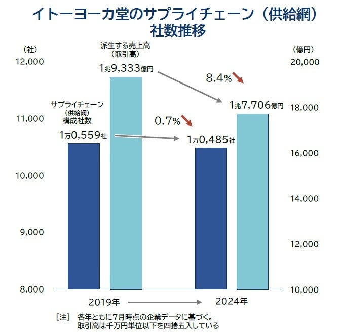 一方で、5年前の2019年(社数:1万559社 取引高:1兆9333億円)と比較すると、社数では74社・0.7%の微減にとどまったものの、取引高は1627億円・8.4%の減少となった。地方を中心にヨーカ堂店舗の閉鎖が続くなかで供給網は維持されたものの、売り上げ規模は大きく縮小した。