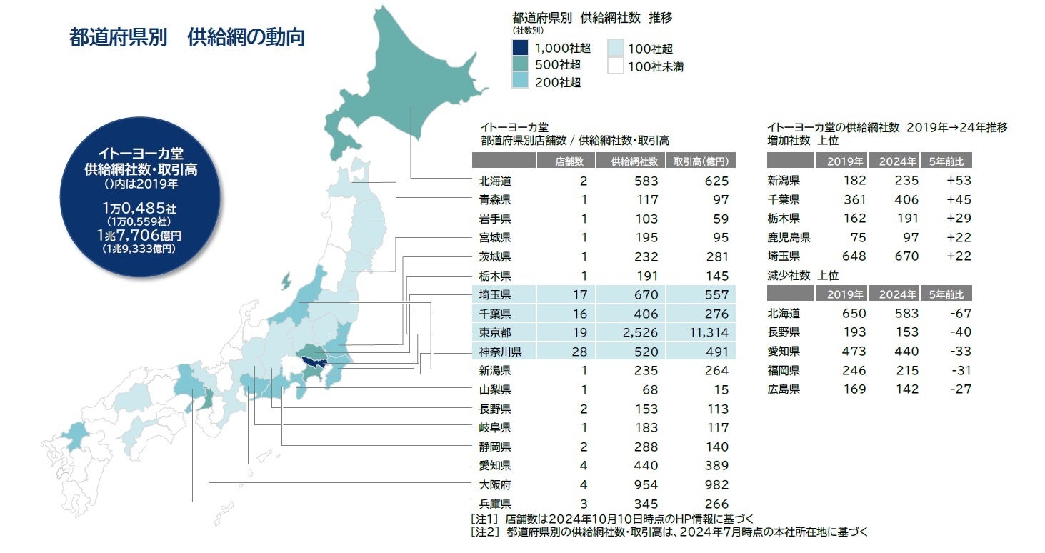 都道府県別に見ると、社数で最も多いのは「東京都」の2526社、取引高は1兆1314億円に上った。埼玉県・千葉県・神奈川県を含めた首都圏エリアで、社数ベースで約4割、取引高では約7割を占め、ヨーカ堂の供給網は首都圏に本社を置く企業を中心に構成されている。