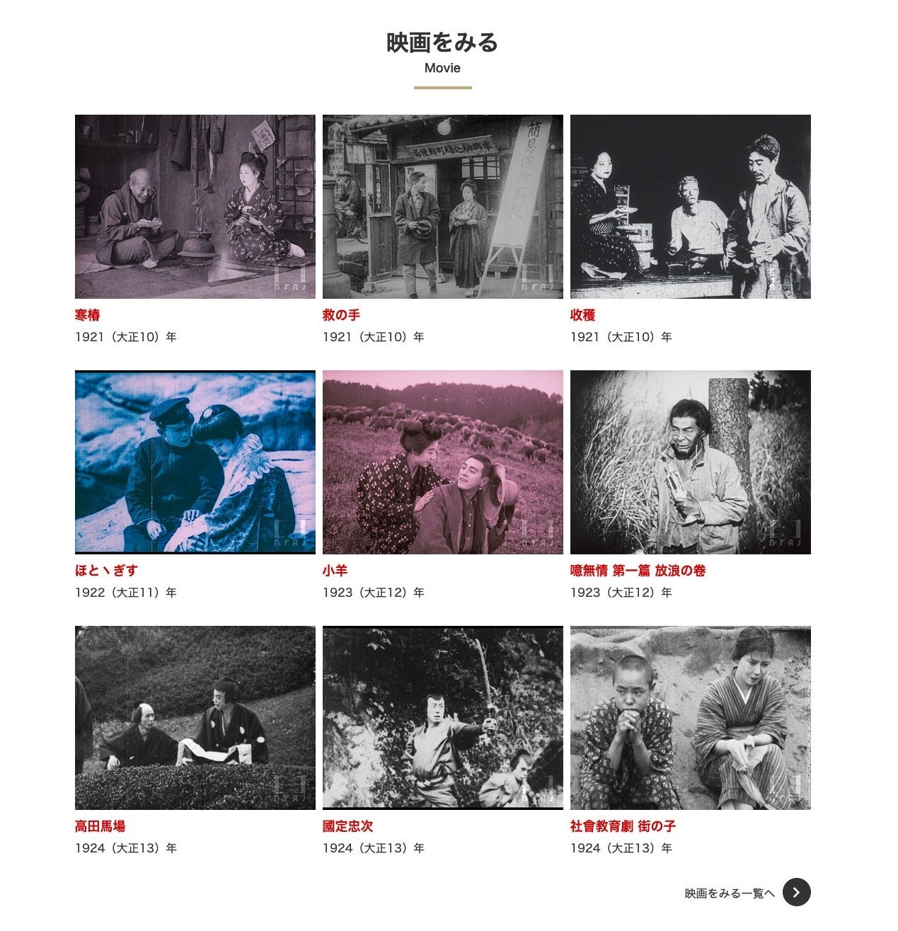 水谷八重子(初代)が名前を伏せて映画初出演を果たし、「新派の異端児」と呼ばれた名優・井上正夫との初共演作でもある『寒椿』、「映画女優第1号」とされる花柳はるみ出演の『收穫』(1921年)、その生涯が小説にもなった伊澤蘭奢出演の『社會敎育劇 街の子』(1924年)、新国劇を創設した澤田正二郎の幻のフィルム『高田馬場』(1924年)のほか、『救の手』、『ほとヽぎす』『小羊』『噫無情 第一篇 放浪の卷』『國定忠次』を公開します(短縮版や断片のみの素材を含みます)。