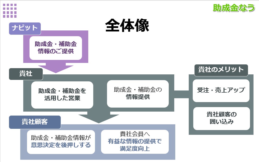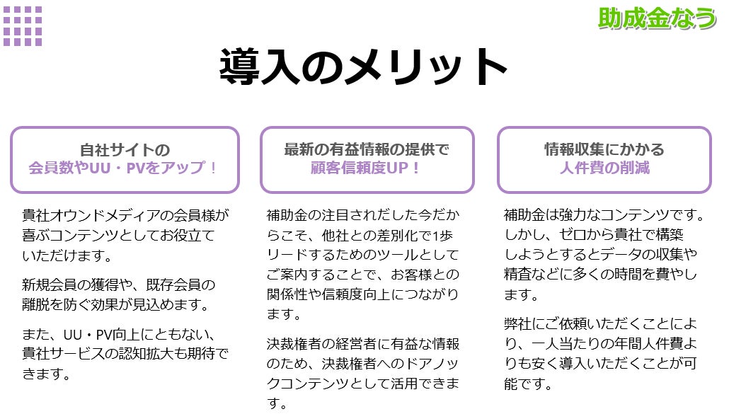 「助成金・補助金情報」という強力コンテンツをお手軽に導入できるサービスです。
