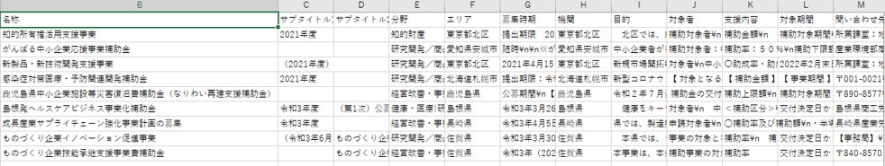 - ご提供データイメージ - 項目例)名称/分野/エリア/支援内容/公募終了日
