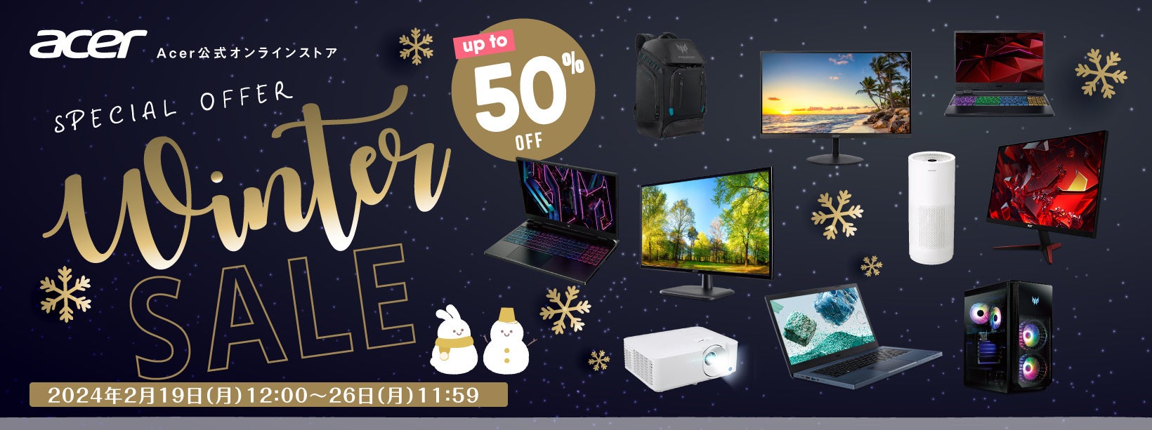 日本エイサー株式会社(本社:東京都新宿区、代表取締役社長:ボブ・セン)は、同社のパソコン、モニター、プロジェクター、ガジェット、空調家電などの各種製品を取り扱うAcer 公式オンラインストアにて、本日2024年2月19日(月)午後12:00~2月26日(月)午前11:59の期間限定で最大50%OFF商品をラインナップしたWinter Saleを開催します。