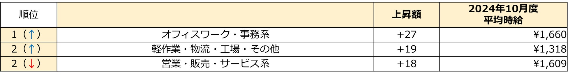 10月度の職種別/前年同月比 時給上昇額ランキング