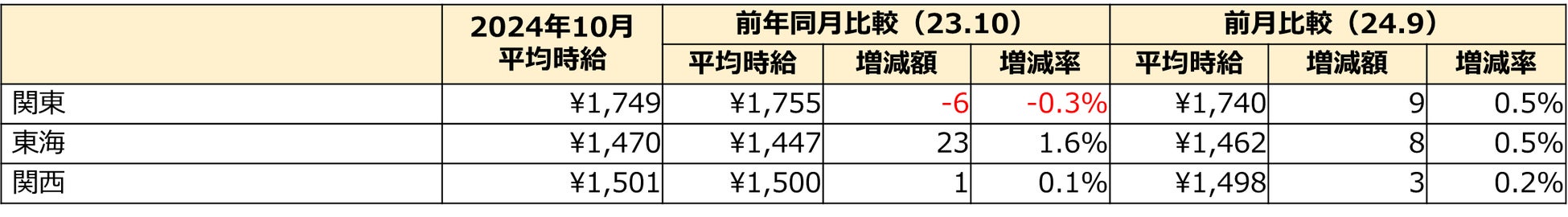 10月度のエリア別平均時給は、【東海】【関西】で前年同月比プラスを記録。