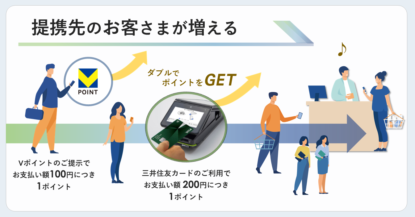『Vポイント』は、ご利用のお客さまのみならず、提携先にとっても魅力的なポイントとなります。従来のTカード/モバイルTカードの提示だけでなく、SMBCグループの各種サービスのご利用や、SMCCが発行するクレジットカードによる決済で貯めたポイントからのご利用も期待できます。また、ポイントが貯まりやすくなることで顧客価値がさらに向上し、提携先へのポイント利用や送客効果の向上にもつながります。