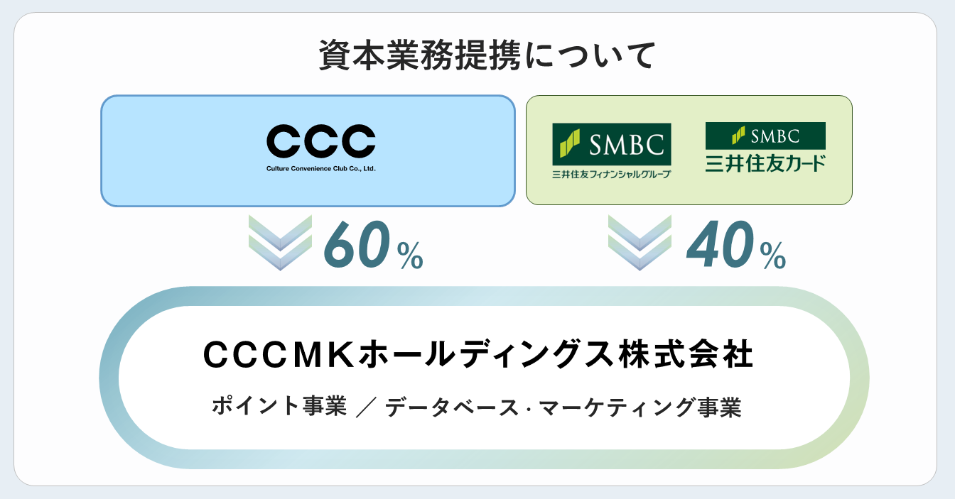 新ポイントサービスの提供に向け、SMFGとSMCCは、2023年4月10日にCCCMKHDへの出資を完了しました。なお本件は、2022年10月に発表いたしました「SMBCグループとCCCグループによる資本・業務提携に関する基本合意」に基づくものです。これにより、CCCMKHDは発行済み株式の60%をCCC、40%をSMBCグループが保有する会社となります。