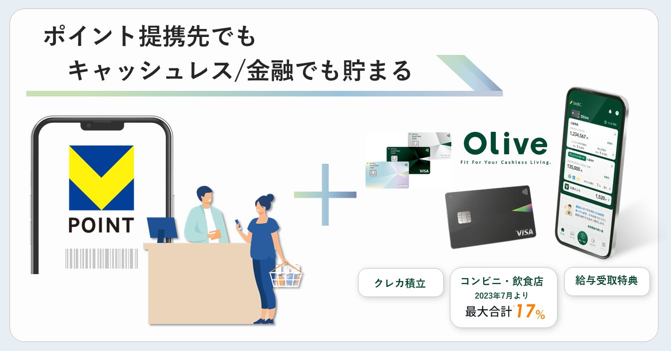 SMCCの決済サービスや、SMBCグループの総合金融サービス「Olive」などを通じて、これまでよりも「貯めやすく」「使いやすく」なった『Vポイント』が、あらゆる金融・非金融サービスをつないでいきます。『Vポイント』提携先で貯めたポイントは提携先のみならず、SMBCグループや、SMCCが提携する各分野のリーディングカンパニーによるデジタル金融サービスでもご利用いただけます。『Vポイント』で、SMBCグループの枠を超え、お客さまはあらゆる非金融サービスをお得にご利用いただけるようになります。