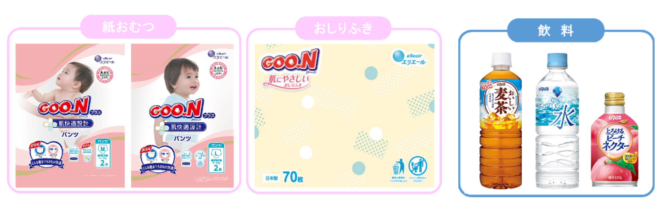 「ベビー用 紙おむつ」は、大王製紙の「グーンプラス 肌快適設計 パンツ 2枚入り」(パンツタイプMサイズ、Lサイズ 各300円)「グーン 肌にやさしいおしりふき 70枚入り」(240円)をダイドードリンコの飲料とともに自販機で販売しています。