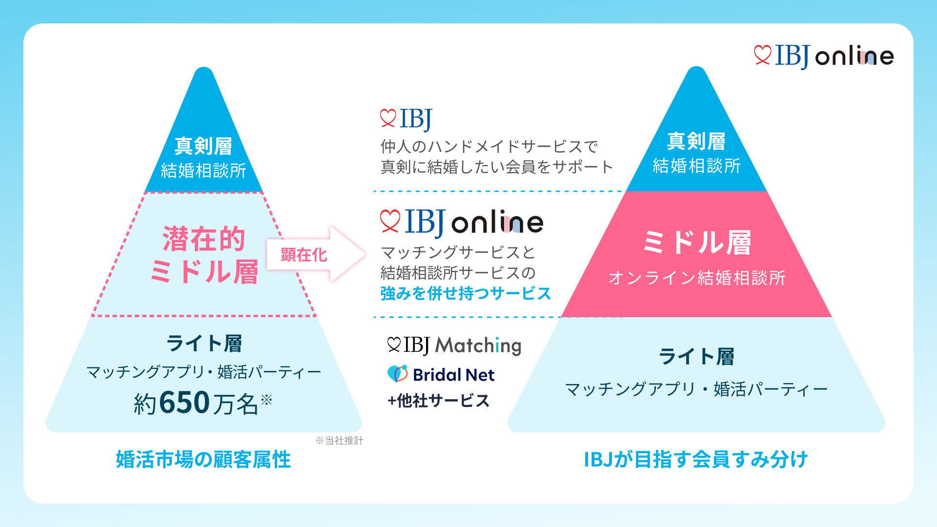 「IBJ online」は、今後もマッチングアプリを利用する「ライト層」と、結婚相談所で活動する「真剣層」の間に位置する、効率と信頼を重視する“婚活ミドル層”にとって最適なオンラインプラットフォームとして進化を続けます。