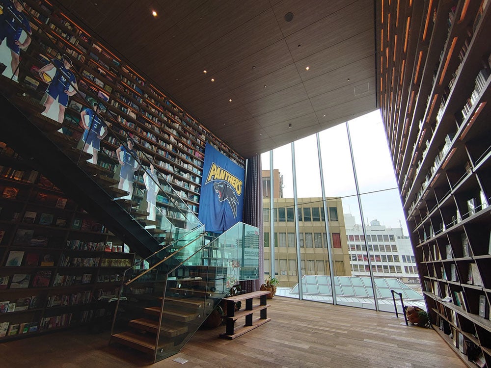 さらに、枚方T-SITEを象徴する、4Fイベントスペース『7mの本棚』がパンサーズカラーである青(パンサーズブルー)一色に。各選手の等身大パネルも展示中。