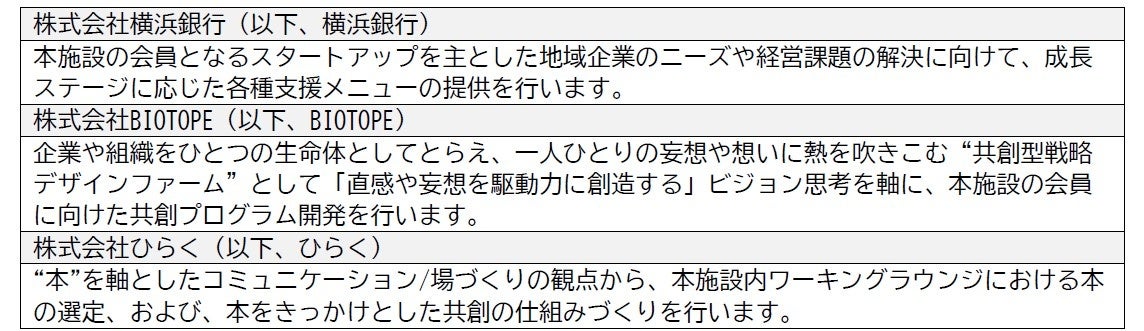 また、本施設は、横浜エリアにおける事業共創による社会課題解決のための複合施設となることを目指し、下記のパートナーと協業することが決定いたしましたのでお知らせします。