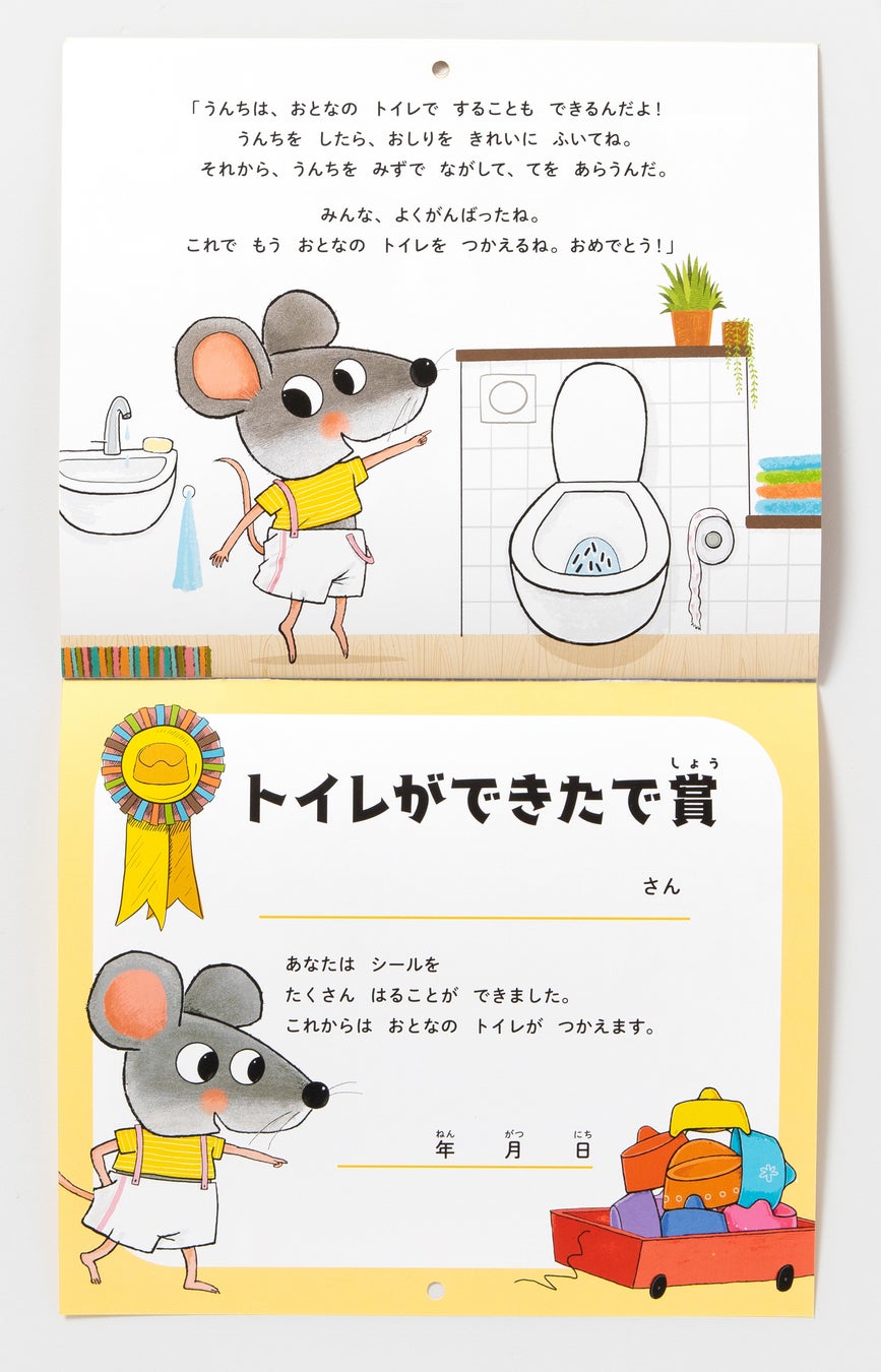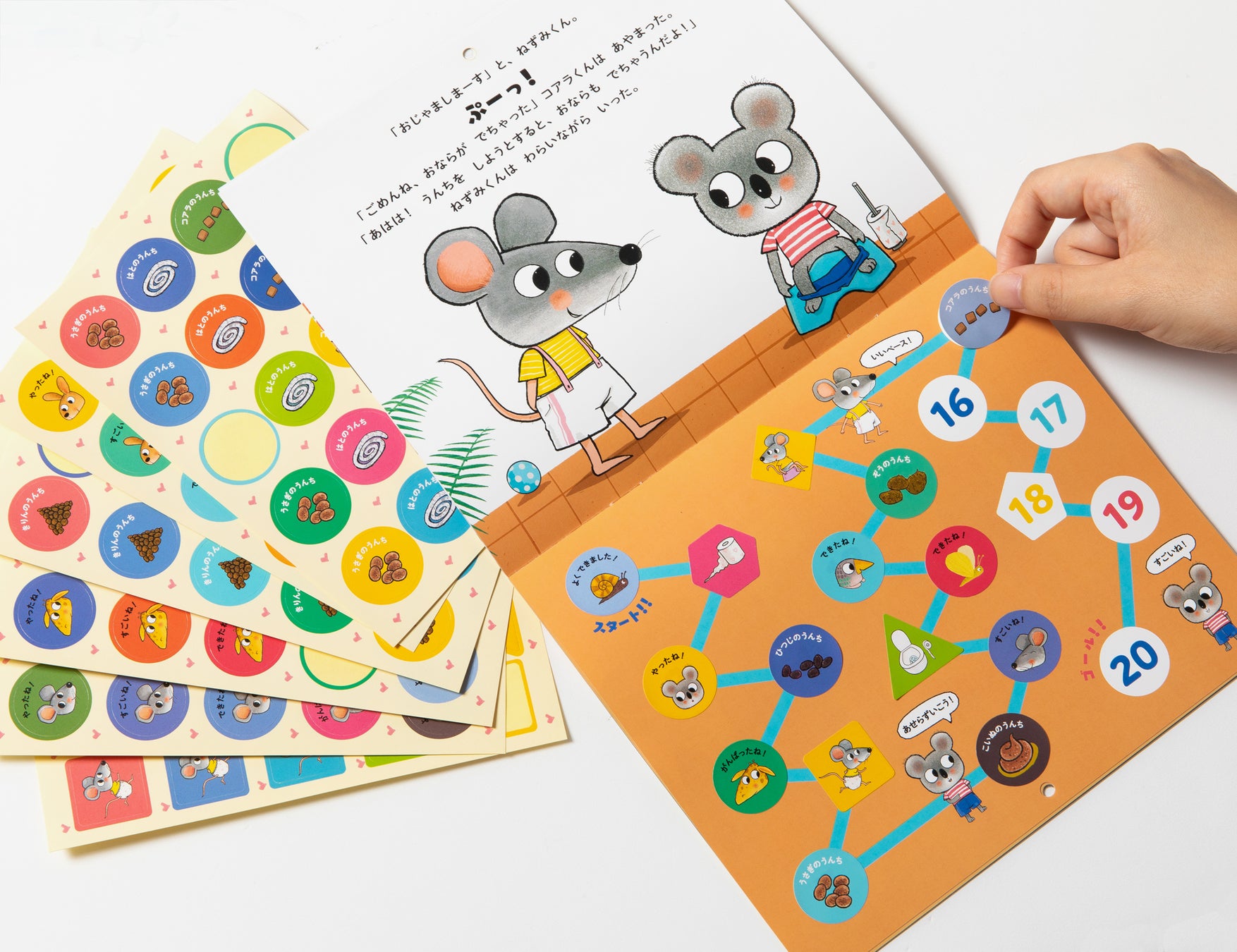 前作より少し大きくなった、知りたがりやのネズミくん。今作では、おともだちのトイレ(おまる)の中が気になって仕方ありません。「どんなふうに、どこでトイレをしているのかな?」と、様々な動物たちのうんちを見てまわります。幼児用トイレやおまるから、大人用トイレへの移行のきっかけに。