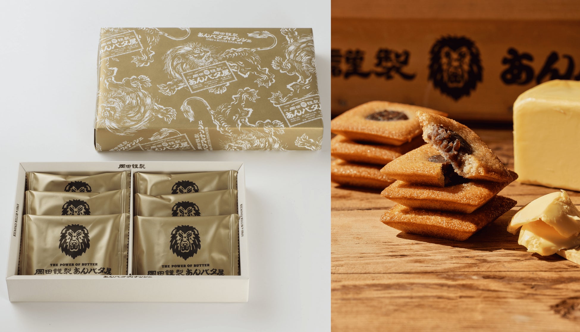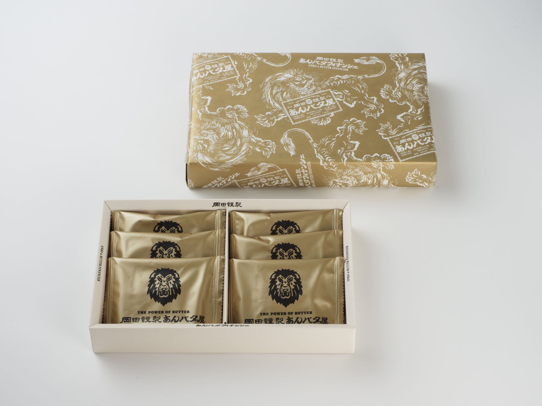 あんバターの力強い味わいや背徳感を表現した、「岡田謹製 あんバタ屋」の象徴である、ライオンのイラストをパッケージに施し、縁起物としてもよく用いられるゴールドをメインカラーに使用。年末年始のご挨拶やお手土産に華を添えるデザインに仕上げました。
