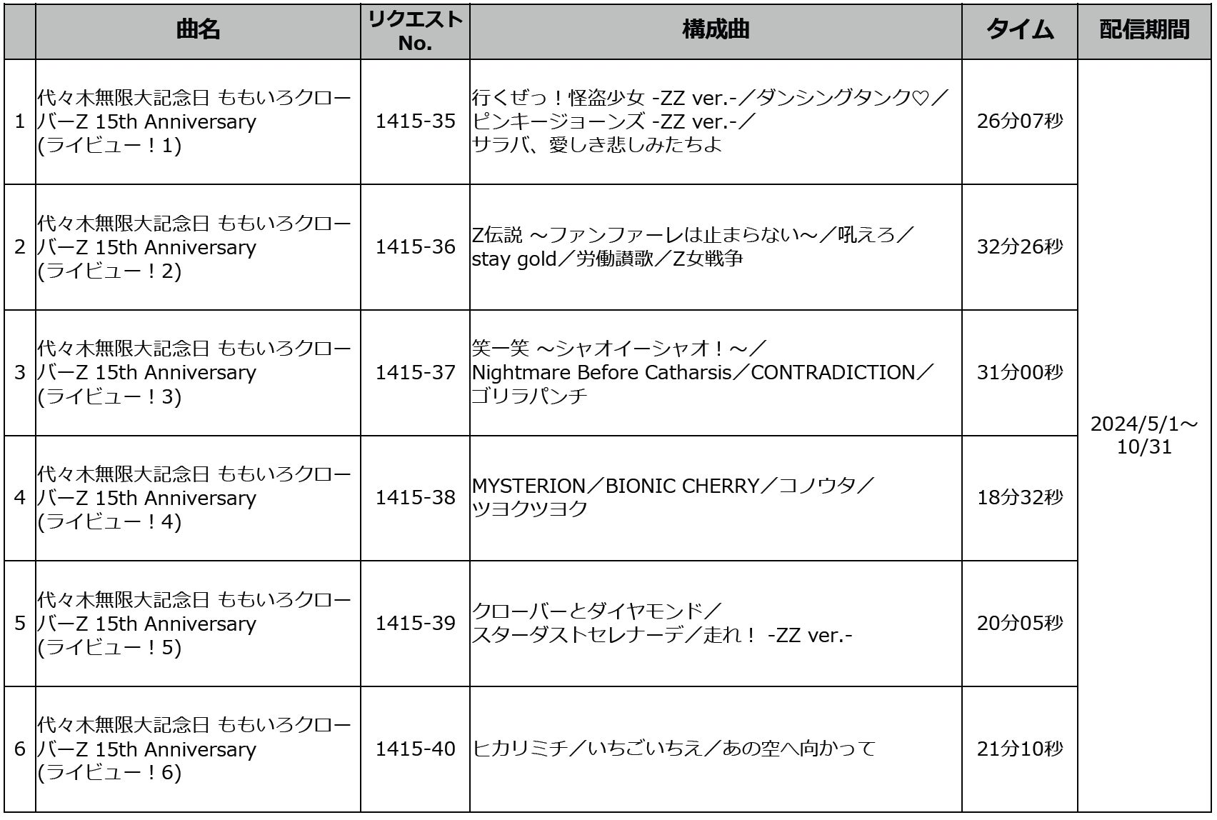 株式会社第一興商は、通信カラオケ「LIVE DAM AiR」および「LIVE DAM Ai」限定の長尺カラオケコンテンツ「ライビュー!」において、ももいろクローバーZが2023年5月に東京・国立代々木競技場 第一体育館で開催した『代々木無限大記念日 ももいろクローバーZ 15th Anniversary』のライブ映像を、2024年5月1日より10月31日までの期間限定で独占配信します。