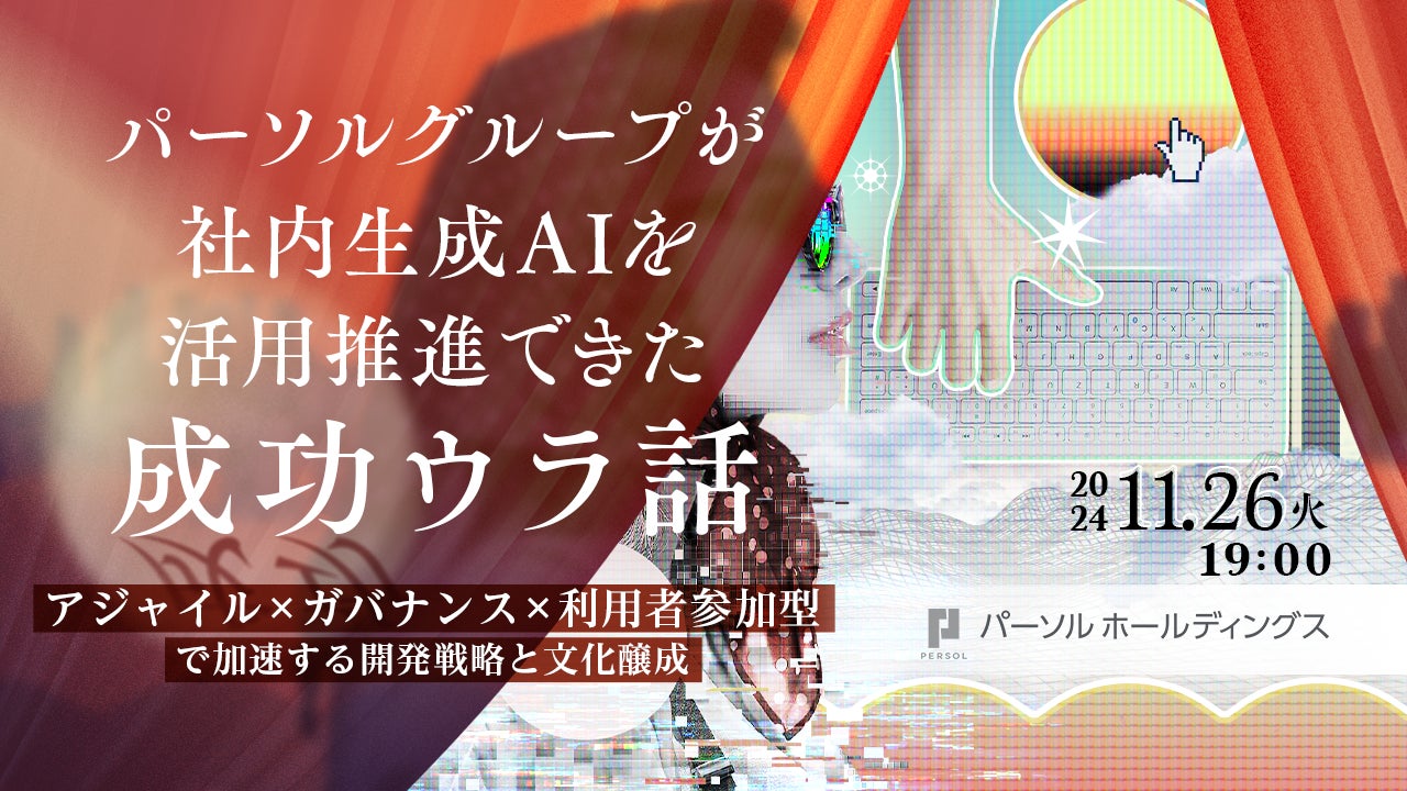 「はたらいて、笑おう。」をグループビジョンに掲げるパーソルホールディングス株式会社(本社:東京都港区、代表取締役社長 CEO:和田 孝雄、以下パーソルホールディングス)は、IT人材向けに企業の生成AI導入や社内の活用推進について自社事例を紹介する特別オンラインイベント「パーソルグループが社内生成AIを活用推進できた成功ウラ話―“アジャイル×ガバナンス×利用者参加型”で加速する開発戦略と文化醸成―」を2024年11月26日(火)に開催することをお知らせします。
