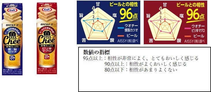 その結果、“赤ワインとステーキ“や“カレーと福神漬け”など、相性が良いと言われる王道の組み合わせにおいて、それぞれが100点満点中94点でしたが、“「クラフト 魚Chee(ウオチー)」シリーズとビール”の相性は96点という王道の組み合わせ以上の高得点をたたき出しました。ビールは強い苦味と酸味が特長であるのに対して、それと同等のしっかりとした旨味・塩味が「魚Chee」にあることで、味のバランスが良く相性が高い結果となっております。
