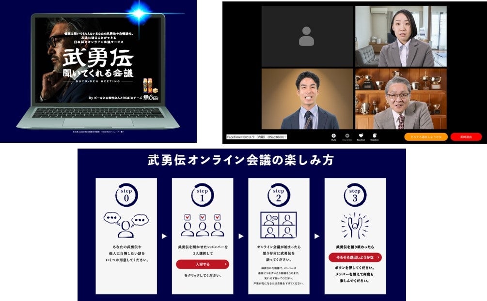 「昔の俺は・・・」「俺の伝説は・・・」なんて話しを聞いてもらえる場がなくなった今。でも分かって欲しい、頑張ってきたことを誰かに聞いて欲しい。そんな思いを叶えてくれるオンライン会議です。8人の聞き上手から気分に合わせて参加してもらいたい3名を選択。嫌な顔ひとつせず、話し手の気分が良くなるくらい、上手く聞いてくれるコンテンツです。