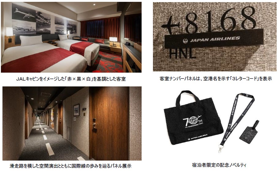 この企画では、JALの監修の下、完成したオリジナルデザインのコラボルームでの宿泊を提供するほか、客室へと続く廊下は滑走路を模したデザインとJALの歴史を振り返るパネル展示を実施します。コラボルームはJALの羽田空港における国際線就航都市数と合わせて24室設けられ、これはJALが実施してきたコラボルームとして過去最大の客室数となります。また、この特別企画を通じて、羽田空港から始まった国際線就航の歴史を羽田の地で体感することができます。
