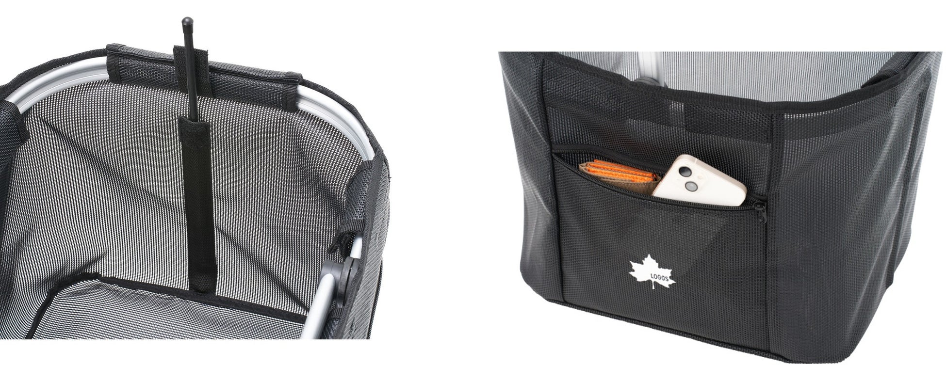 両サイドにフレームが入っており自立式なので出し入れも快適。便利な小物収納ポケット付き。