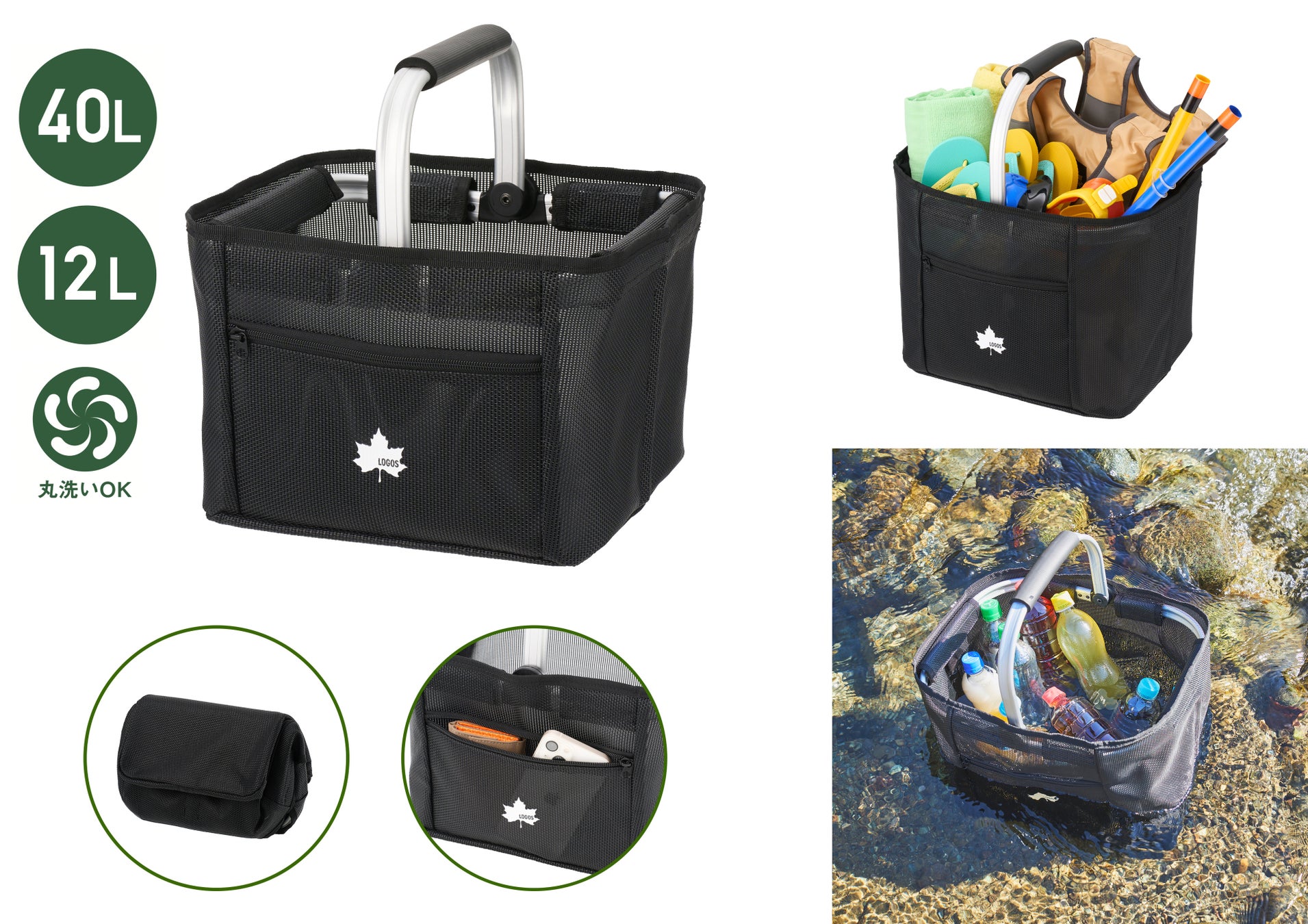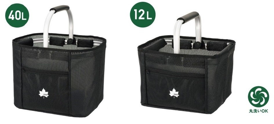 テスリンメッシュ生地を採用した折りたたみ式のバスケット。たっぷり容量40LのLサイズと、ちょっとした小物の運搬に最適な容量12LのMサイズをラインアップ。