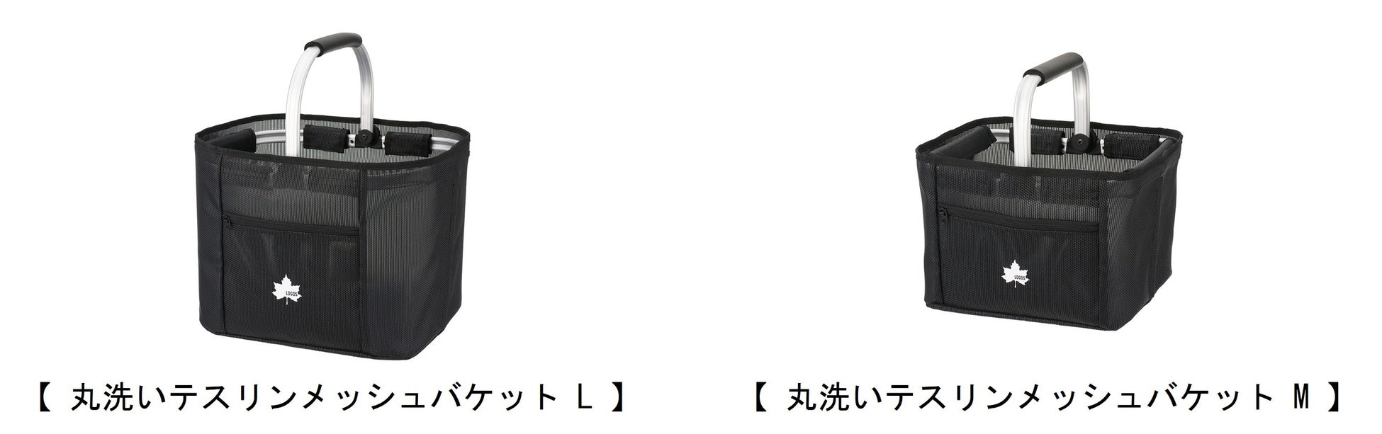本アイテムは、テスリンメッシュ生地を採用した折りたたみ式のバスケットです。たっぷり容量40LのLサイズと、ちょっとした小物の運搬に最適な容量12LのMサイズをラインアップします。