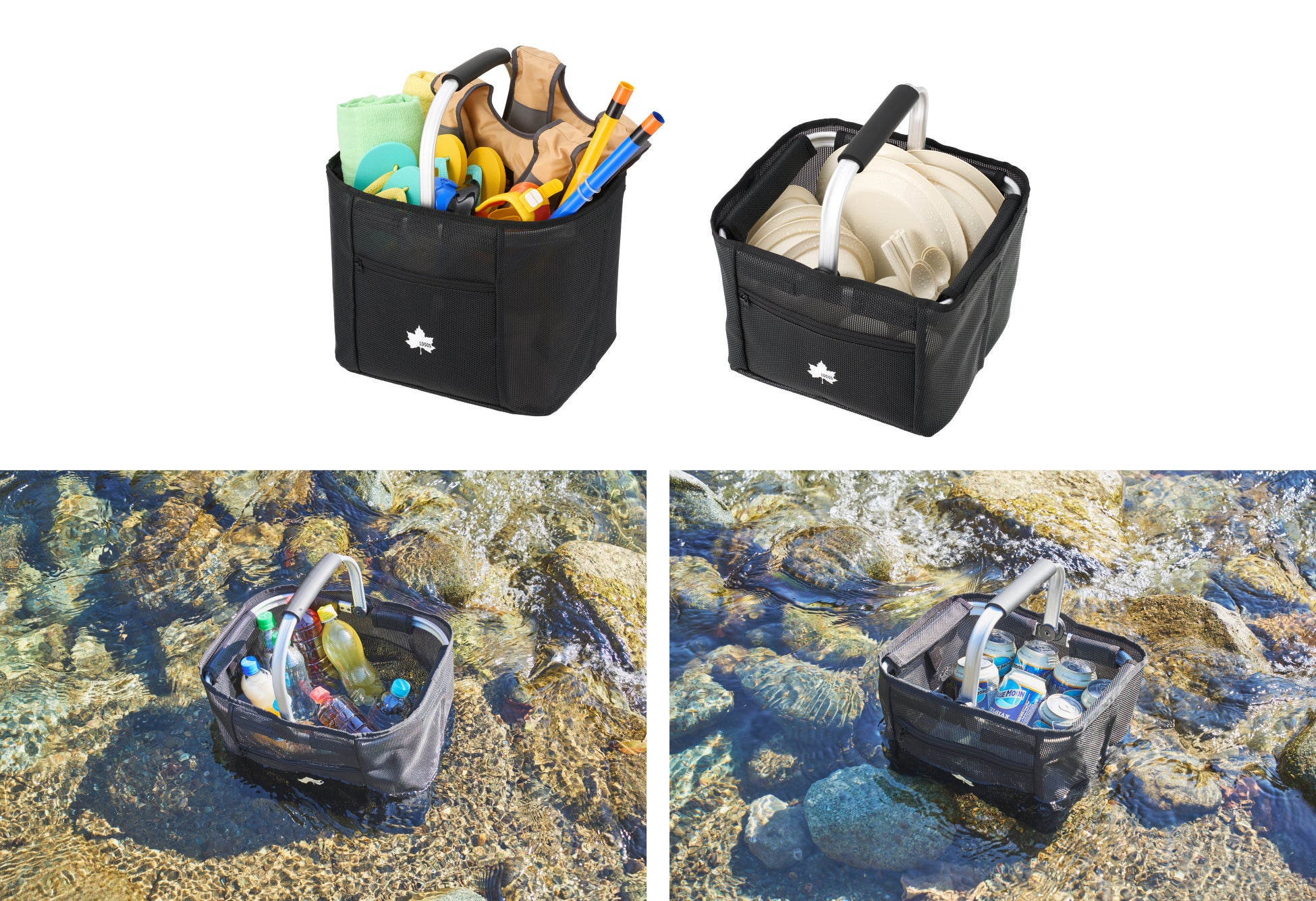 ビーチや川遊びグッズの収納から、キャンプで洗い終わった食器の一時置き、ランドリー入れ、さらには缶ビールやペットボトル飲料をバスケットに入れたまま川に沈めて冷やすなど、アイデア次第で幅広い使い方が可能。