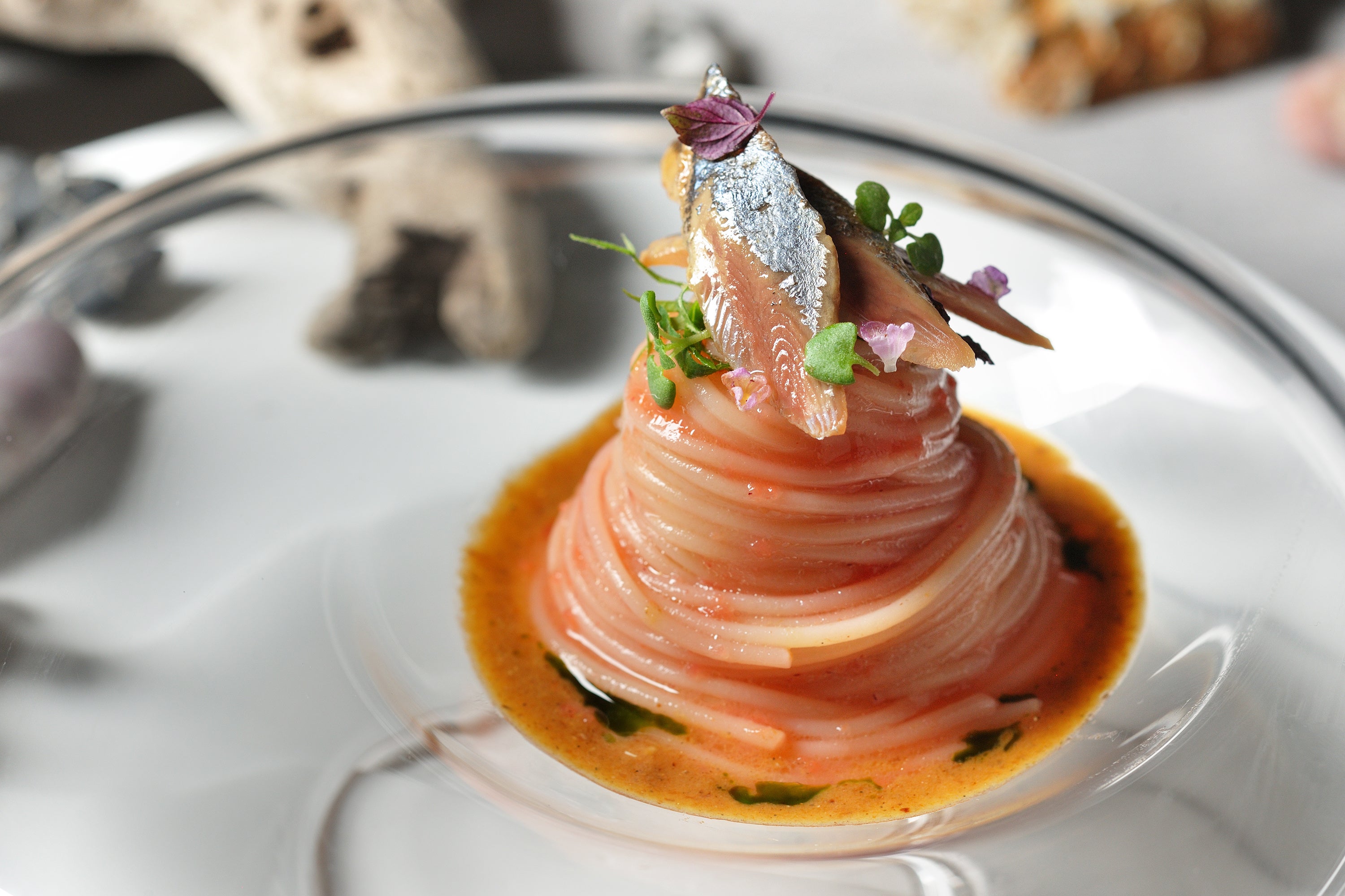 秋の味覚、秋刀魚の旨味を存分に味える冷製パスタを提供します。秋刀魚をまるごと使用した濃厚なスープは、脂がのった身と内臓や骨のほのかな苦味が特徴です。パスタはトマトのピューレを絡め、大葉をのせてさっぱりとした味わいに仕上げました。秋刀魚のスープと合わせることで、トマトの甘みがより一層引き立ちます。秋刀魚の旨味と、トマトの爽やかな味わいの調和を楽しめる一品です。
